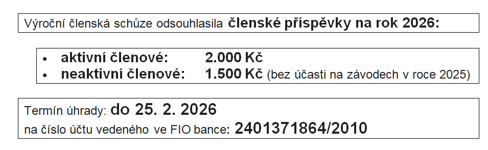 - neaktivní členové: 1500 Kč (bez účasti na závodech v roce 2025)